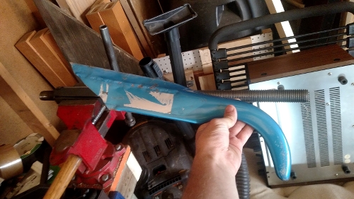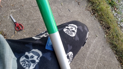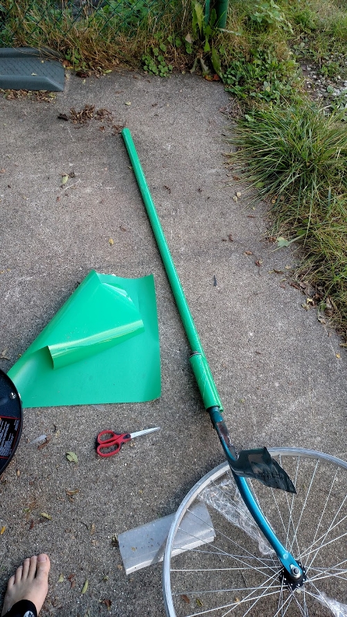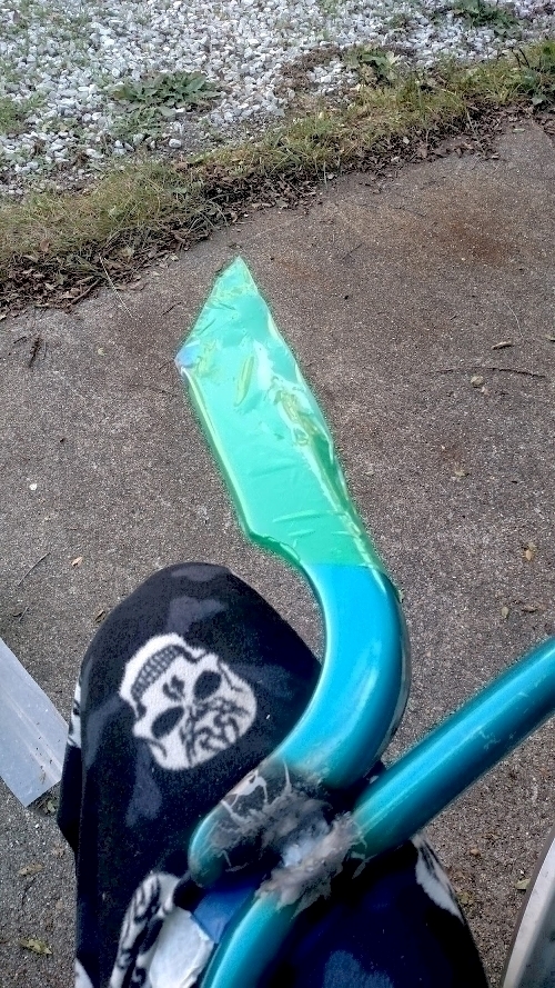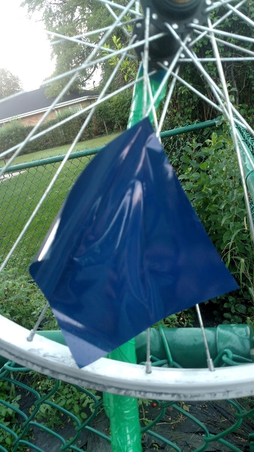 Finish was determined and installed (green vinyl with blue accents to give a flower like appearance of (I like forget me nots and will likely color the hub yellow in the future). The green vinyl was a fun pickup. I thought about going with something more natural but decided for a more distinct color combination. I initially tried to use saran wrap for the blades on the spokes but then went with sections of vinyl. I applied all of the vinyl in sections to make it easier to apply. This was much less time consuming than painting. All parts had been previously cleaned for welding so prep was fairly minimal except for cleaning the welds and heat affected zone/additional spatter.