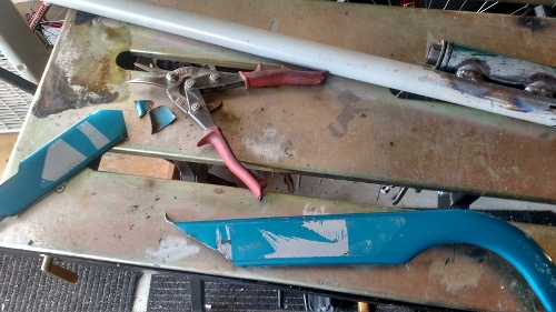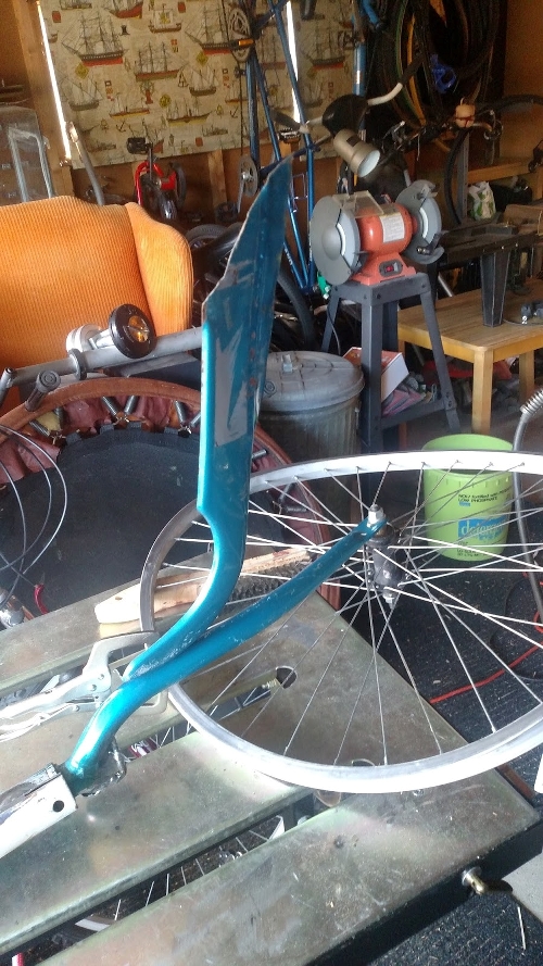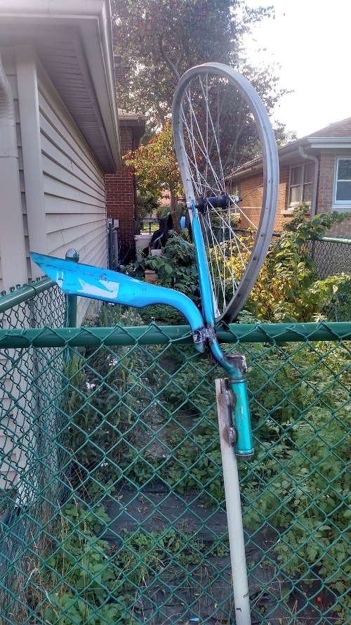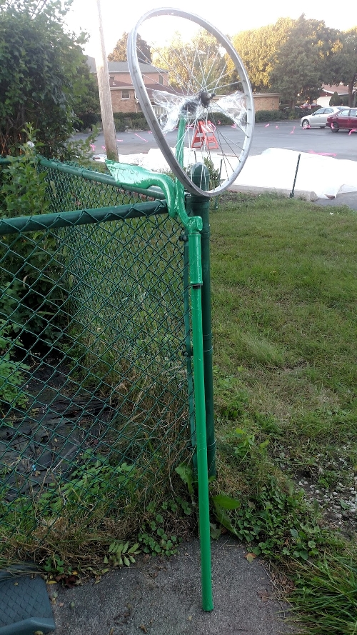 This leaf was added so as to be more stable in wind (built from tin snipped half of the bicycle chain guard). Bearings were swapped to lower rolling resistance. I am glad the frame I used was a very solid steel Schwinn frame as the gauge of the walls on all of the parts was nice and heavy limiting heat warp and allowing for beefy welds.