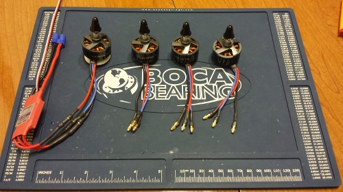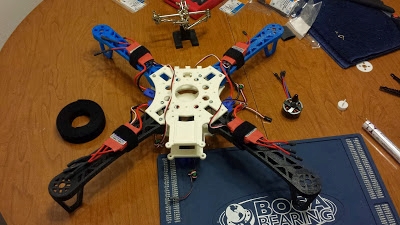 Even though the 3D printer is down, I have printed enough various quadcopter pieces that I can make a basic mock-up of the quad using what I do have. In fact, everything but the 2 blue arms will probably be used in the final build. The blue arms were test prints that ultimately won't be used. I attached the ESCs to the arms with velcro strips and plugged them into the power harness. The next steps will be that I mount the motors, and connect the radio and flight controller so I can start testing all that stuff.