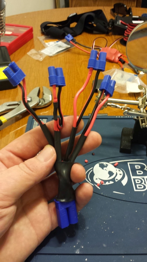 To get power to all four ESCs, I chose to use an EC5 connectors at the battery, split it four ways, and use EC3 connectors at each of the ESCs. To keep it simple, I soldered all 4 wires into a single EC5 connector, rather than use a power distribution board or start with 2 and then split 2 into 4.