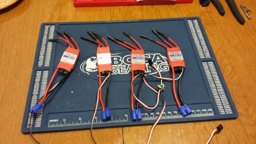 Electronic speed controls with female bullet connectors on the motor side, male EC3 connectors on the battery side.