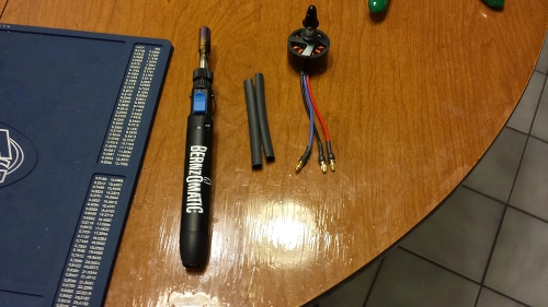 I don't have a heat gun at home. To shrink the heat shrink, I got this little Bernz-O-Matic butane torch for $9.99 from Home Depot which has a heat gun tip, and also a soldering tip. I haven't tried the soldering tip yet, but I think it's great to have a cordless soldering iron if I need one.