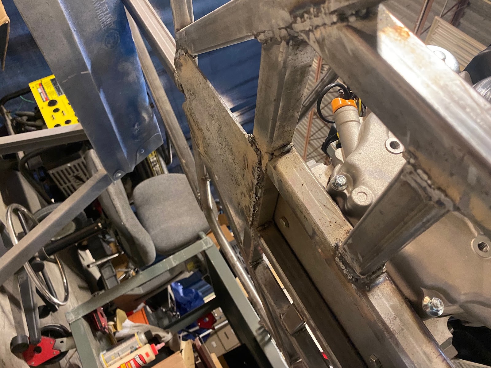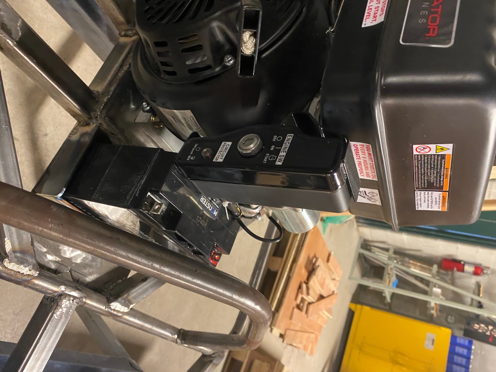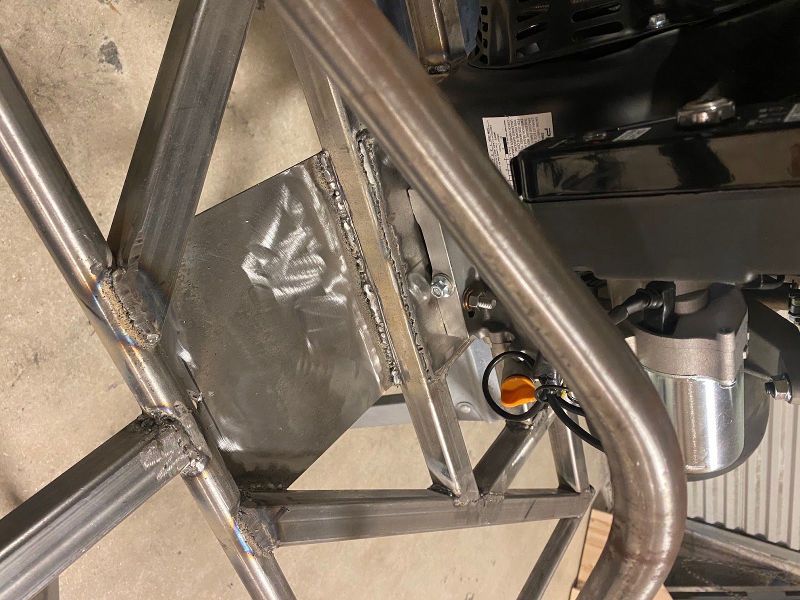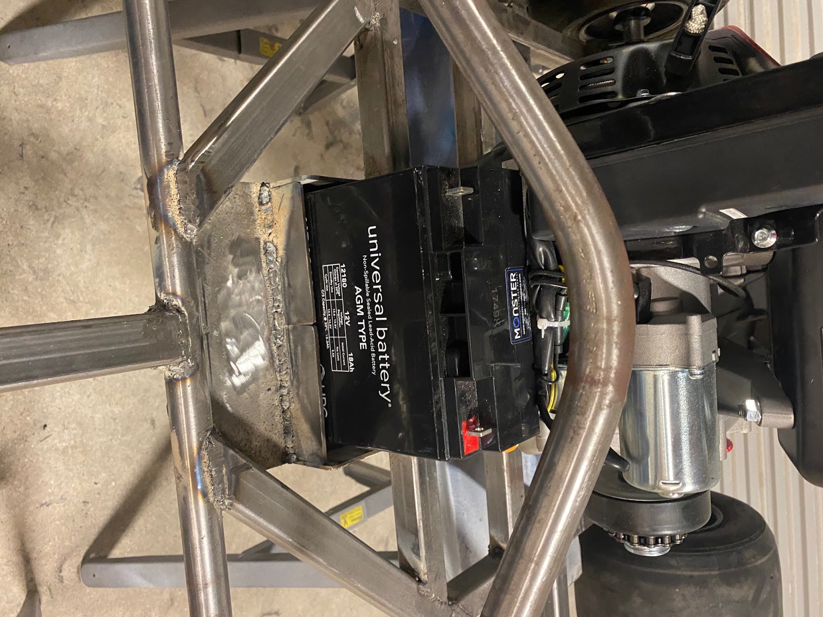 For the next step I wanted to make a battery mount so I could utilize the electric start feature this motor comes with.  I began with a piece of steel plate and welded it to the frame, using scraps to create a boundary for the battery.