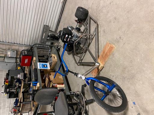 After sourcing the bike that I wanted for the front end of the trike, I began to cut the frame of the bike to fit onto the rear trike frame.  I also wanted to remove most of the paint that was originally on the bike so I could weld supports in.  Sanding off the paint also leaves room down the road to put a fresh coat of paint on it, which I plan on doing.