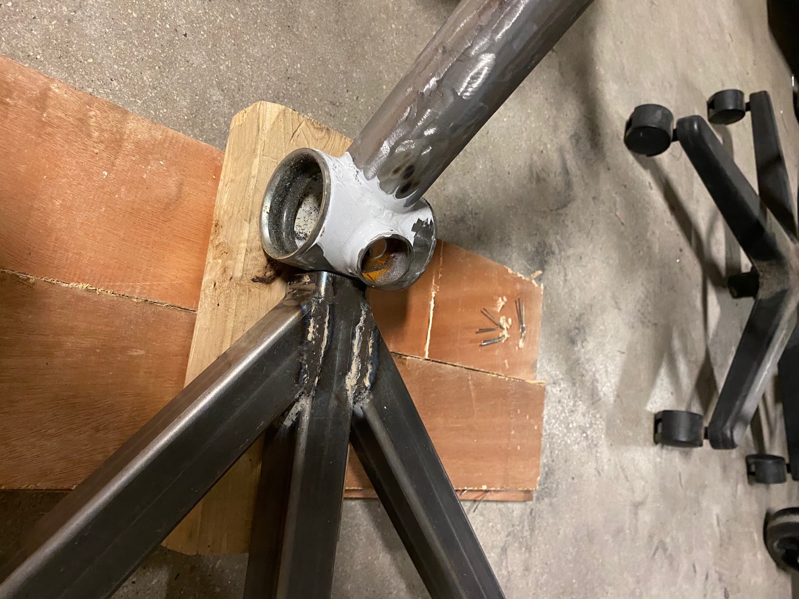 After cutting the frame and sanding down the paint to bare metal I took down the rear assembly from the sawhorses and mocked up the position of the front end on the floor.  It’s really starting to come together now!