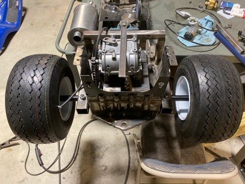 The next step is to mount the rear brake caliper and then fire her up for a test on some jack stands to check clearances and belt tension.  We would also like to practice shifting the transmission into gear before we do a full road test.  I would also like to address the exhaust once we know the mower is fully operational.  Although the stacks look cool and attract attention, a more low profile setup under the vehicle would be better in the long run.  It’s just going to take some time to fabricate properly.