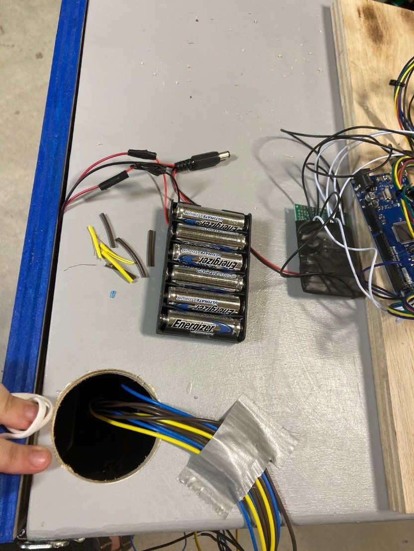After the switches were mounted, soldered, and wired, the power system needed to be configured, wired, soldered, and debugged. A simple off and on switch was connected to three wires, one leading to the Arduino to register input of power, one leading to ground, and another leading to power from the battery pack. This power switch was mounted via a drilled hole in the side of the skeeball machine, with its cords leading into the inside of the machine. Cable management was implemented by grouping together the LED wires, the switch wires, and the power wires with zip ties, and the groups accordingly separated by Arduino input wires, power, and ground.