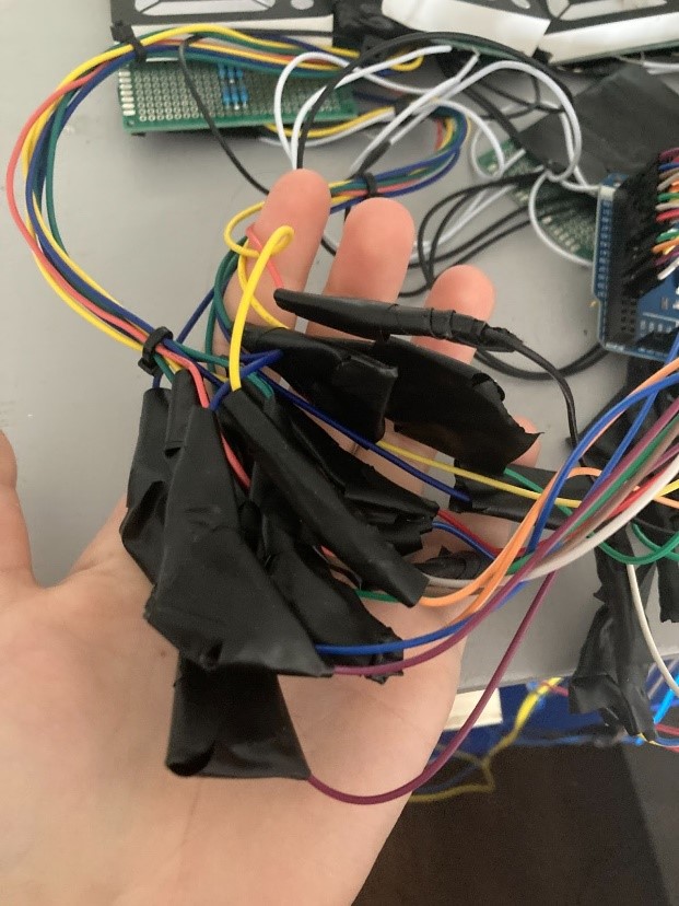 The finished LED wiring is seen in figure 5, showing the 7 wires coming from each individual LED and all 6 perforated boards attached to the back of the LED via soldered pins. The boards, wires, and resistors were covered with electrical tape for protection of the electronics and additionally for handing with flowing current. Additionally, the LEDss were wired to connect to a battery pack which would provide and regulate the amount of current going into the LEDs.