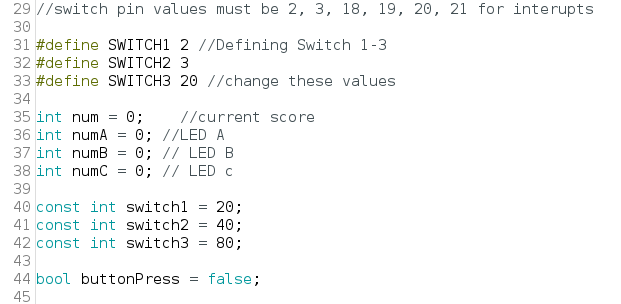 The switches needed the be also defined as variables, and the values following the SWITCH1, SWITCH2, and SWITCH3 variable names are their pin values. These switches would only be registered by specific pins on the Arduino mega board, and their values were determined via the website’s documentation provided for the Mega. Additionally, the int statements establish the variables as single digit numbers and set the value equal to zero to allow for linear counting. The const int declaration establishes the values for each of the switches, which register as the counting increments for the LED when the switches are pressed.