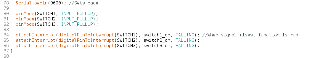 As seen in figure 19, there is a second instant of the pinMode declarations, except involving the switches. This INPUT_PULLUP allows for the switches to be set to registering input, as determined by pressure pushing the switch wire down via either hands or balls. Additionally, the attachInterrupt allows the software to interrupt the code loop to allow the switch input to be processed by the Arduino without slowing the processing loop speed. This is repeated for all switches as seen.