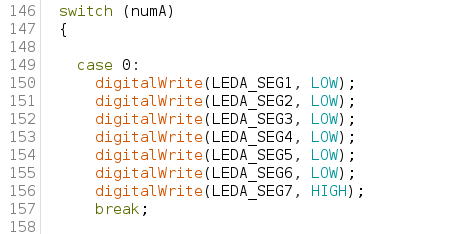 This code references the specific LED segment display code, which is unique to each number. As seen in figure 23, this example references the number 0, and displays a perfect circle. The LOW and HIGH values attached to each segment value correspond to which values are activated and which are deactivated, respectively. This process was repeated for all numbers 0-9 across all 3 LEDs.