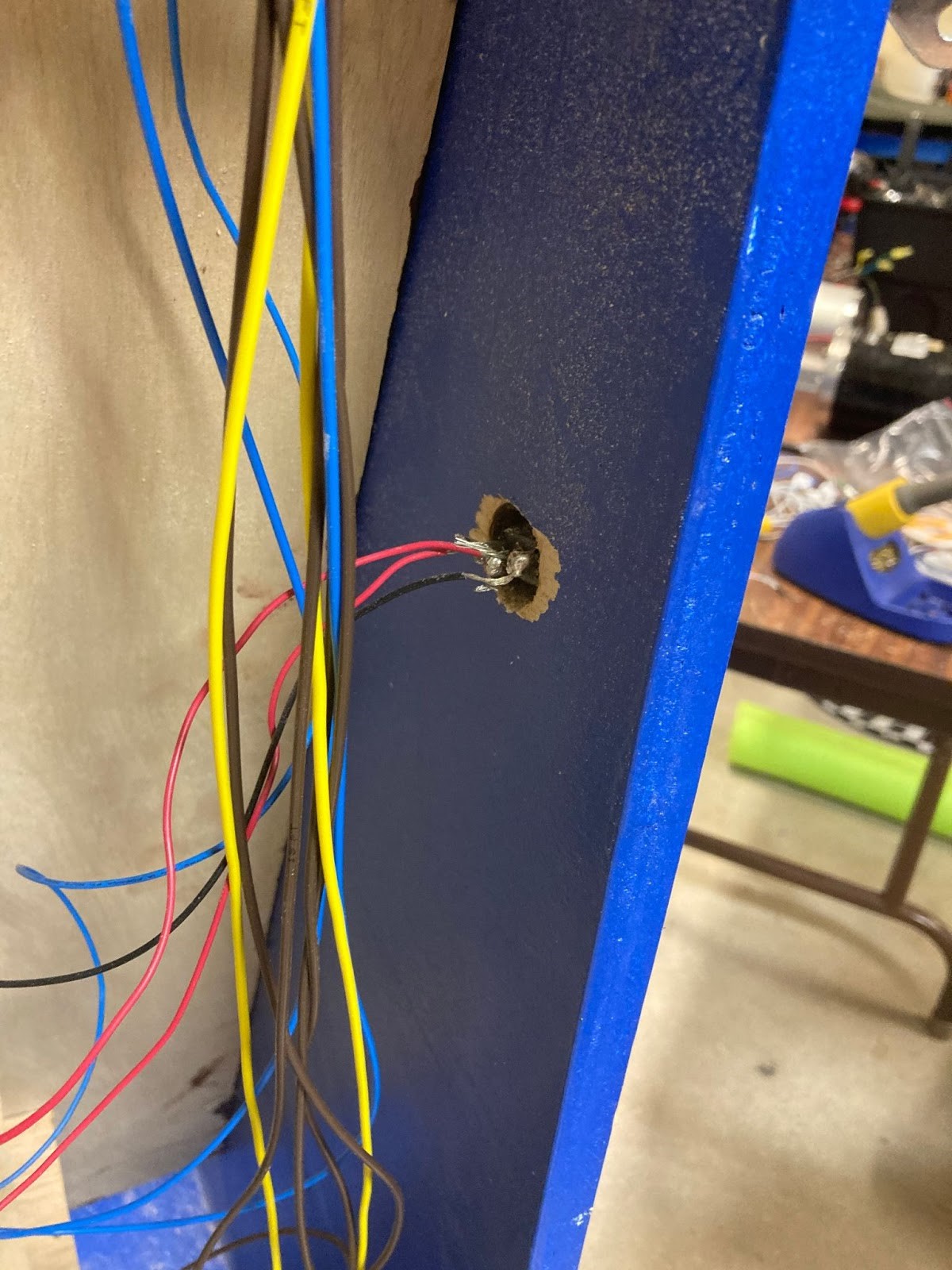 These wires were stripped on the end, and the individual copper lines were soldered in order to create a strong enough tip to insert into the Arduino. There were three lengths of wires, corresponding to the three varied heights of the skeeball ball boxes. Initially in the project, all 3 wires were connected to the switch, however due to a lack of data sheet, eventually the switches were reduced to two wires as explained later in the post. Additionally, a large hole was drilled into the top of the skeeball machine, seen in figure 11,  in order to allow the wires to flow unrestricted into the main electronics housing at the top of the machine. This also allowed the wires to be completely internally kept inside the machine, for both protection of the electronics, as well as functionality of the closing skeeball machine back door.