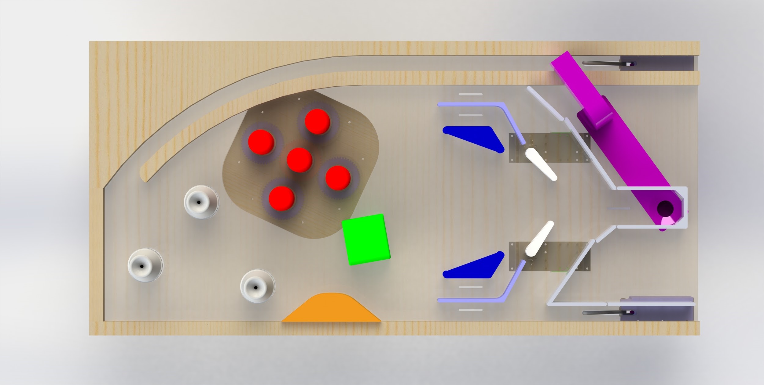 This week I worked on finishing up the play field designs. To finish off the play field I added the guides for the ball return system, designed the caps for the slingshots, laying out a twin tunnel obstacle to score points in, and designed a spinning pillar obstacle that uses a gear box and one motor to spin five pillars and fling the pinball all over the board. To simplify my design process of the gearbox a little bit I was able to find gears of the right diameter on McMaster-Carr, download the model and then tweak the model to fit my needs. The beauty of it is I have gears where I know the critical dimensions are correct and I can now 3d print them and have the shaft keyway customized to something that better fits my design.