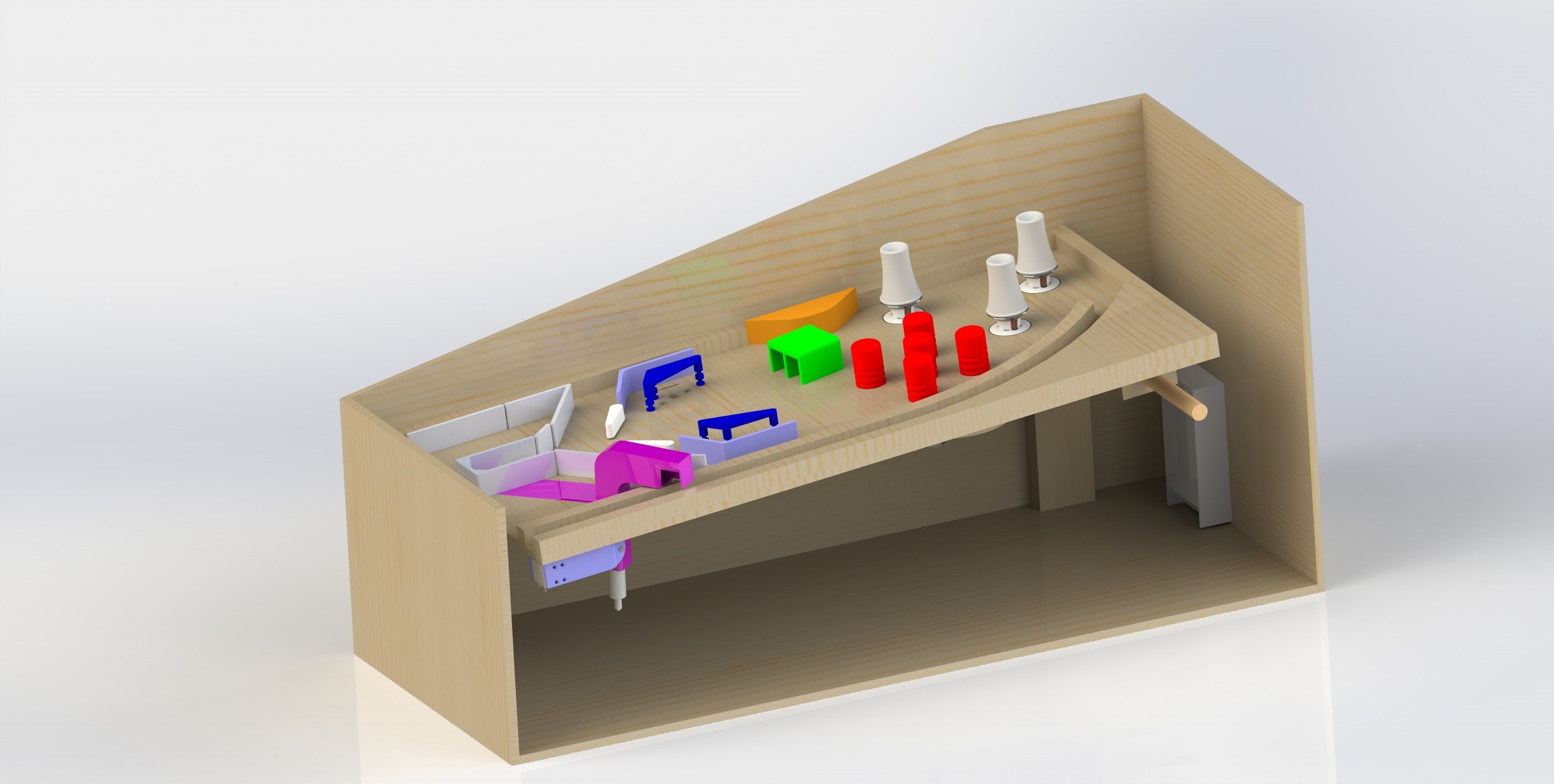 In adding these features I had to tweak a few things on the board to make the new parts fit with minimal interference on the underside of the play board. This further illustrated why it is necessary to take the time to make a good model and then the assembly process goes so much smoother. But after taking the time to make these adjustments I know that everything will work smoothly  when I go to build the real thing.