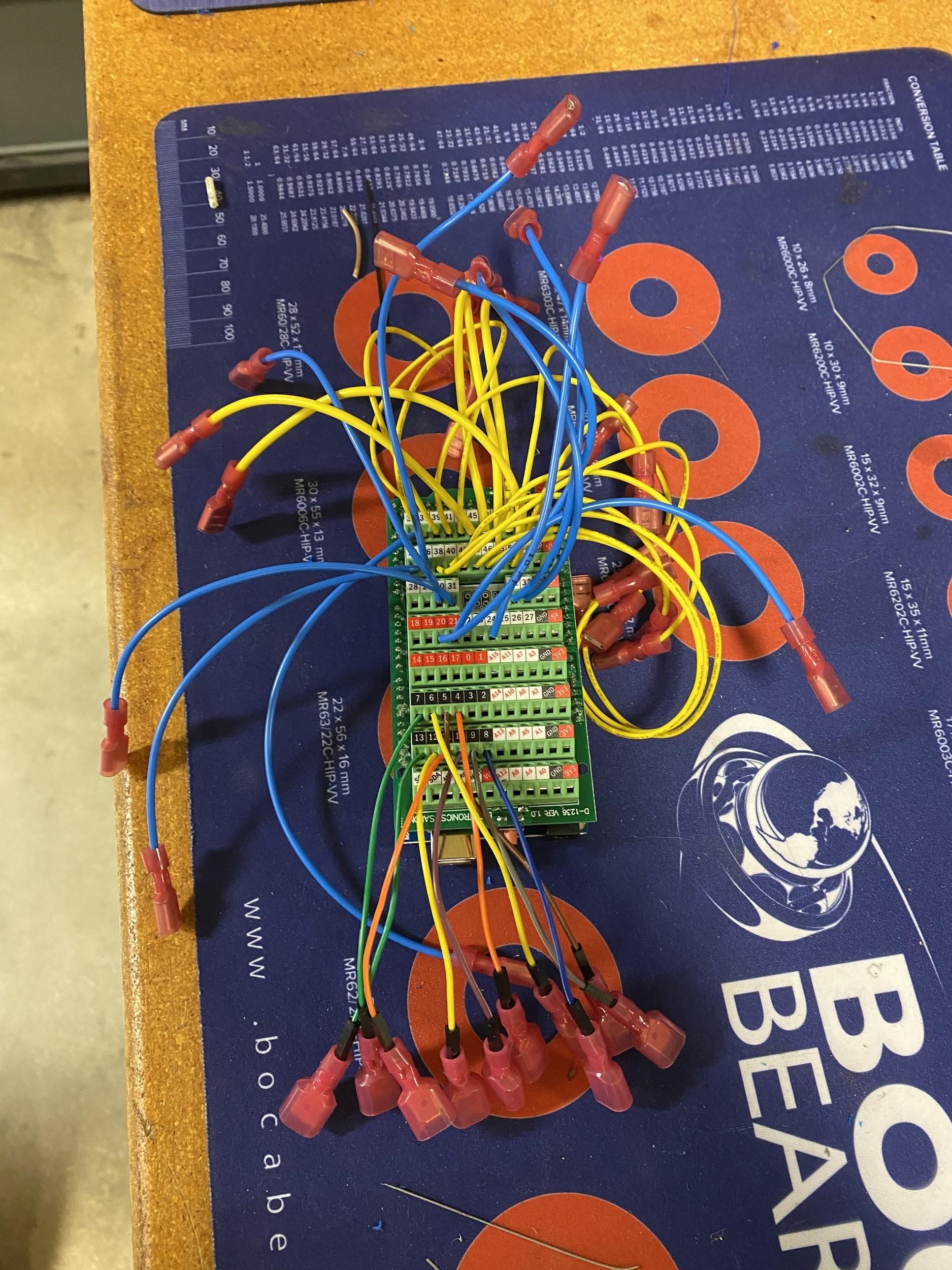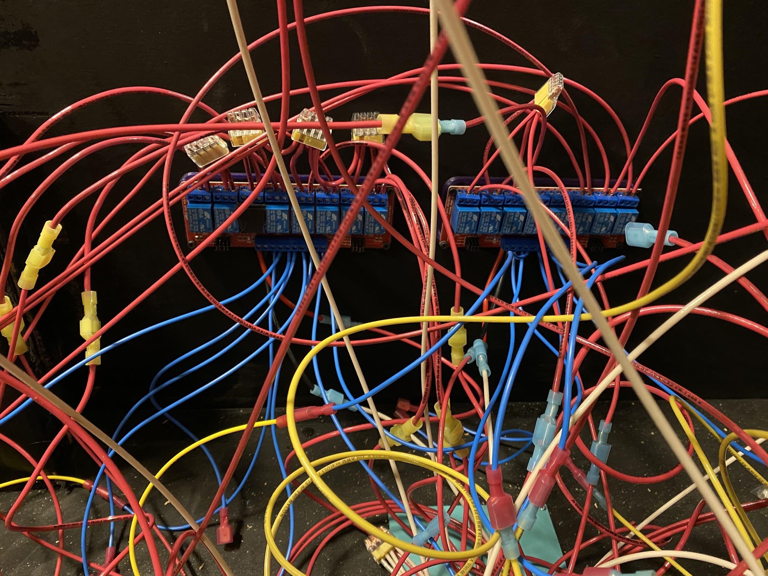 After coming to the conclusion that a score board would not be viable, I wired up all the electrical components and the input devices to their respective relays. This makes the system a fully analog system where if you press a button it trips the relay and flips on the respective device. As soon as the button or switch is released the relay will flip right back to its open state resetting the device. This is a much simpler system then what a score board would require as It would have relied on the button sending a signal to the arduino and then the arduino counting how many points that signal was worth and then throwing the signal over to the relays to trigger them. While this would have allowed some really cool stuff to be done in the code, it does make  it a lot harder from an electrical stand point. And that electrical complexity is why this rout was forgone in favor of the analog system that was implemented.