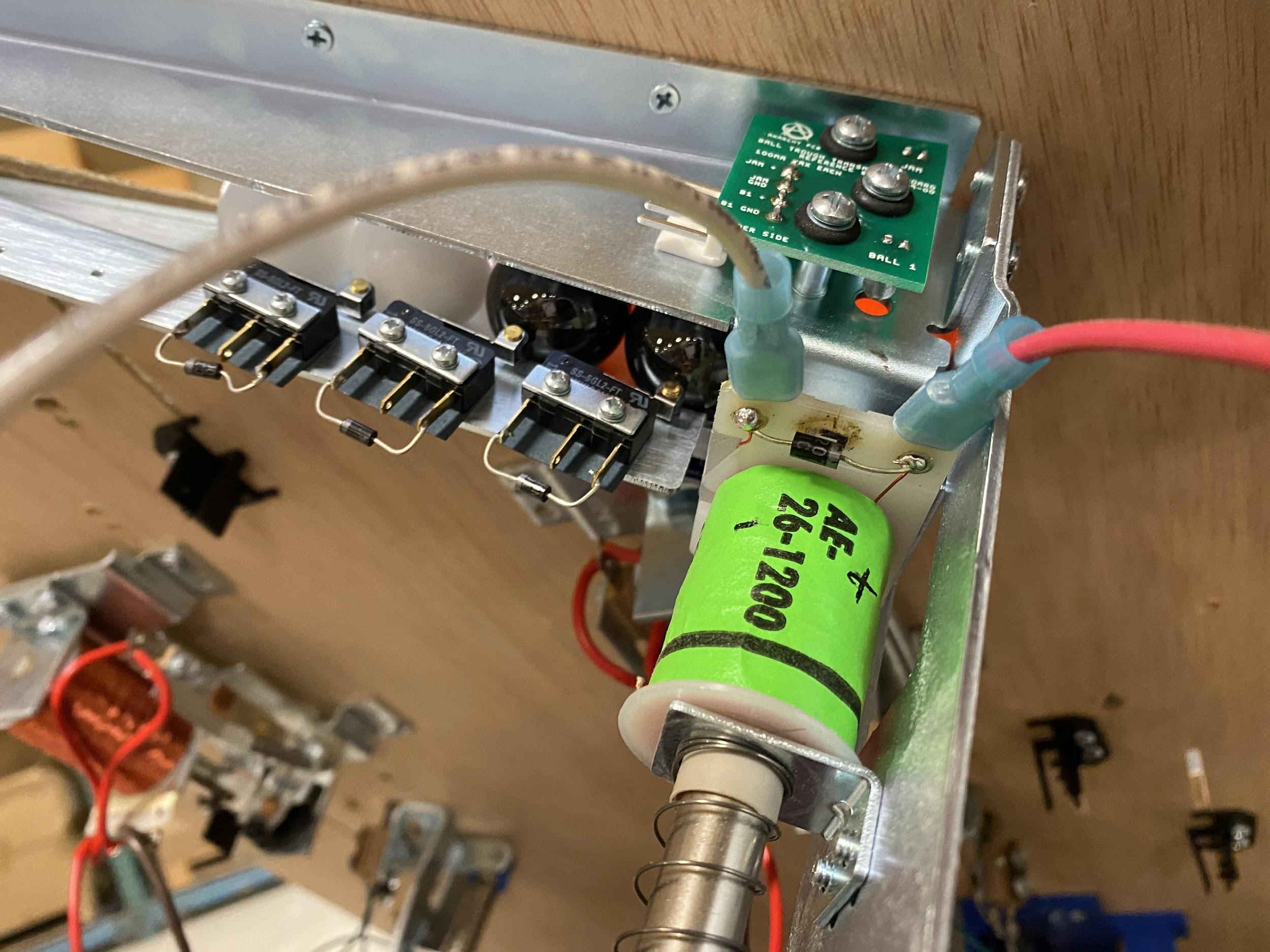 Now that I have covered what was done to get this thing working and why the scoreboard was abandoned, lets go over some of the flaws of the system. And we’ll start with one of the most glaring flaws, the launching system. The problem with this system is that it lacks the power to adequately launch a stainless steel ball bearing and as opposed to redesigning it in such a way that would resolve this issue I used Silicon Nitride ceramic bearings. If this were to be put into large scale production or even for someone trying to recreate this machine at home this is a problem from a cost standpoint as for the average consumer these balls would run about $70 a pop thus they are very cost prohibitive. A solution to this problem would be to use a plastic ball bearing but this introduces a new problem of the game being almost unplayably fast. This may also be able to be solved by making the ball kick out onto the play field sooner as opposed to all the way at the top like it is now. So while this is an issue to watch out for there are enough work arounds for this that anyone following along at home should not run into much trouble here.